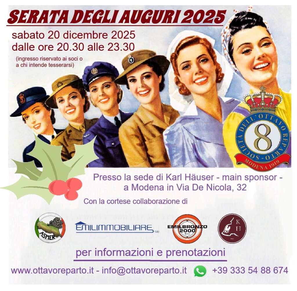 Dopo un anno di sospensione dovuto ai necessari lavori di ristrutturazione della suggestiva sede di Karl Häuser, avrà luogo il tradizionale appuntamento di fine anno per  i soci della Società dell’Ottavo Reparto nella serata degli Auguri. L’evento, che è occasione della pubblicazione della bozza del bilancio consuntivo, è un’ottima opportunità per i nuovi iscritti, amici e parenti che volessero prendere contatto con gli organizzatori delle diverse iniziative. Per informazioni e prenotazioni, contattare la segreteria.